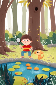 An animated cartoon of a boy in a red shirt and blue pants holding a tennis racket. The boy is standing in front of a pond that is filled with water. There is a small brown dog sitting on the ground in the middle of the pond. There are trees on the left and right side of the image. The trees have leaves on them. The leaves are orange and yellow.