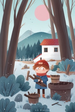 a cartoon depiction of a boy in a red hat and blue coat is standing in the middle of a forest. The boy is holding a bunch of sticks in his hands