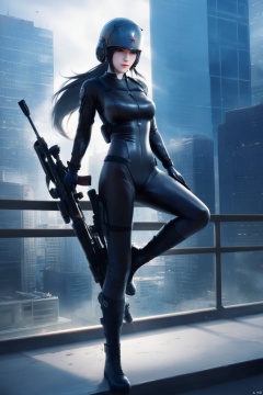 score_9, score_8_up, score_7_up,highly detailed digital,CG,1girl, solo, long hair, black hair, gloves, ponytail, weapon, boots, gun, bodysuit, helmet, building, rifle, realistic,