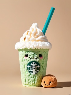 SDZT, A doll,plush style,solo,looking at viewer,personification,jellycat style,smile,simple background,sitting,food,cup,no humans,shadow,blue background,drinking straw,ice cream,food focus,the whole presents a cute and lovely style,solid dark background,1 cup starbucks matcha frappucinol milk tea,