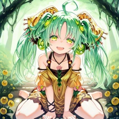 masterpiece, best quality, high quality, Traptrix Sera \(ygo\), 1girl, solo, long hair, looking at viewer, smile, open mouth, hair ornament, dress, twintails, jewelry, sitting, green eyes, yellow eyes, flower, ahoge, :d, green hair, barefoot, bell, wariza,