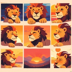 DWBQ,Cartoon-style drawing of a lion with a mane and regal posture, displaying a spectrum of facial expressions in a 3x3 format. Each look is distinctive, including regal, curious, playful, and protective. The lion's claws are prominent in several poses. The background is a golden sunset. The art style is majestic and dramatic, with strong contrasts and bold outlines.