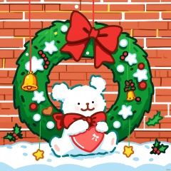 SDTX,Cartoon-style drawing of a white teddy bear holding a red heart, set against a green Christmas wreath adorned with holly leaves, berries, and stars. The wreath is decorated with a yellow bell at the top and a red bow. The background is a red brick wall with a white snow cap at the top. The image has a playful and festive aesthetic, with bright and vibrant colors. The composition uses symmetry and the rule of thirds. The background is in focus. The image has a very high aesthetic quality.