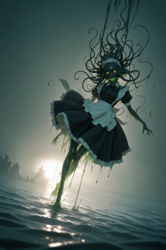masterpiece,best quality,amazing quality,very aesthetic,absurdres,newest,in the style of fashion photography,light particles,cinematic lighting,Visual impact,sharp focus,Emotionalization,depth of field,dynamic pose,dutch angle,extreme aesthetic,scenery,cthulhu,maid,a gloomy scene,weird,chaotic scene,halluci,ocean,the body seeps a lot of strange liquid,weird liquid,dunk liquid,dim,heavy fog,thick fog,liquid nitrogen,white fog,