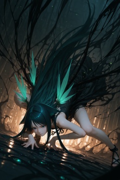 masterpiece,best quality,amazing quality,very aesthetic,absurdres,newest,in the style of fashion photography,light particles,cinematic lighting,Visual impact,sharp focus,Emotionalization,depth of field,dynamic pose,dutch angle,extreme aesthetic,scenery,1girl,saya \(saya no uta\),saya no uta,chaotic scene,squatting on the ground,halluci,terrible liquid,black smoke,black mist,mist,
