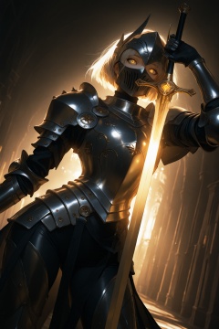 masterpiece,best quality,amazing quality,very aesthetic,absurdres,newest,extreme aesthetic,in the style of fashion photography,light particles,cinematic lighting,Visual impact,sharp focus,Emotionalization,depth of field,dutch angle,scenery,intense light,golden light in the dark,girl holding the sword,tight armor,intricate textures,real metal material,