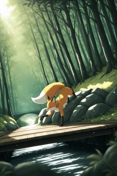 masterpiece,best quality,amazing quality,very aesthetic,absurdres,newest,extreme aesthetic,in the style of fashion photography,light particles,cinematic lighting,Visual impact,sharp focus,Emotionalization,depth of field,dutch angle,scenery,chii-kun \(seedyoulater\),(naguru \(cyoroama\):0.8),(fuamusea:0.8),makoto shinkai,(fox:1.2),(no humans:1.1),paws,fur,(cute:1.2),comfy,solo,yawning,stretching,OO,forest,bridge,creek,burrow,day,sunlight,sun rays,beautiful background,