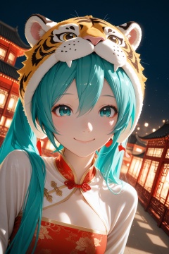 chinese_new_year,chinese architecture,festive,cheerful picture,it's refreshing,tiger hat,hanfu,china dress,point to the sky,happy smile,night,real light and shadow effect,ray tracing,face focus,Hatsune Miku,extreme aesthetic,in the style of fashion photography,light particles,Visual impact,sharp focus,Emotionalization,depth of field,dynamic pose,dutch angle,