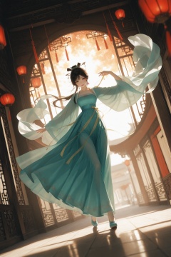 masterpiece,best quality,amazing quality,very aesthetic,absurdres,newest,chinese_new_year,a lively street,hanfu,chinese clothing,china_dress,long_skirt,extreme aesthetic,in the style of fashion photography,light particles,cinematic lighting,Visual impact,sharp focus,Emotionalization,depth of field,scenery,dynamic pose,dutch angle,dance movements,slender build,