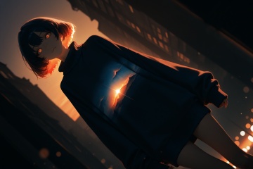 masterpiece,best quality,amazing quality,very aesthetic,absurdres,newest,extreme aesthetic,in the style of fashion photography,light particles,cinematic lighting,Visual impact,sharp focus,Emotionalization,depth of field,dutch angle,scenery,Sunset Glow Palette,( Expressionism:1.7 ),(Chiaroscuro:1.3) lone girl,oversized sweater,