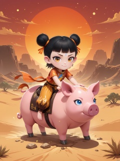 LZNZ,1BOY, full body,A round face with expressive large eyes, topped with short black hair styled in two small buns. A blue dot adorns the forehead.A boy stands proudly on a floating island with stars beneath her feet. Riding a pink pig, Digital illustration of a fierce, young warrior with a curious and adventurous smile. His short black hair is styled into two high buns tied with orange ribbons. he wears an orange and brown outfit that mimics the texture of leather, paired with yellow and brown desert-patterned pants. The background is a vast, golden desert under a blood-red sunset, evoking a sense of exploration and mystery. The art style is rugged and vivid, with a desert fantasy theme.