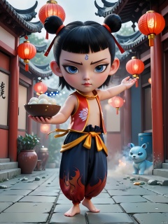 LZNZ,1BOY, full body,A round face with expressive large eyes, topped with short black hair styled in two small buns. A blue dot adorns the forehead, simple and clean scenes,nezha,the boy holding A bowl of glue pudding. traditional Chinese courtyard with glowing lanterns and fireworks, spirit pearl energy radiating from forehead, flowing cosmic ribbons, hyper-realistic 8K rendering in neo-Chinese cyberpunk style, cinematic mist effects, intricate cultural details by Artgerm and WLOP