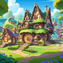 DTJZ, Game individual building, A high-quality digital depiction of a whimsical fairy village with tiny cottages and enchanted gardens. The village features grand trees with houses built into their trunks, and glowing mushrooms illuminating the pathways. The foreground showcases tiny fairy creatures and vibrant flora. The background is a pristine white, drawing focus to the village's fairy-tale beauty. The composition uses curves and organic shapes, emphasizing the structure's whimsical charm. The lighting is soft and magical, adding to the village's dreamlike ambiance. The image is a delightful escape into a world of fantasy.