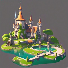 DTJZ, Game individual building, A meticulously crafted digital illustration of a fairy-tale castle, with towering turrets and enchanted gardens. The castle is surrounded by a protective moat and drawbridge. The foreground showcases a cobblestone courtyard and whimsical statues. The background is a seamless white field, making the castle's magical design pop. The composition integrates curved lines and organic shapes, enhancing the enchanting ambiance. The lighting is dreamy and ethereal, casting a magical glow. The image has a captivating aesthetic appeal.