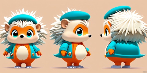 SST, ip design, is presented from three perspectives: front, back and side. The background is pure white. A mischievous cartoon hedgehog with spines that shimmer in a metallic silver, eyes gleaming like topaz, and a belly that's a creamy beige. The hedgehog has tiny, curious eyes and a pointed snout. It's clad in a cozy, striped sweater in shades of teal and orange, and a tiny, matching beret.