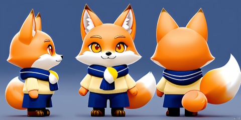 SST, ip design, is presented from three perspectives: front, back and side. The background is pure white. A mischievous cartoon fox with fur that's a rich, red-orange hue, eyes that gleam like gold, and a tail that's bushy and white-tipped. The fox has sharp, alert eyes and pointy ears. It wears a stylish, striped scarf in shades of blue and yellow, and a cozy, matching sweater.