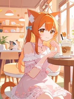 illustrating a playful anime cat-girl with orange hair and cat ears, wearing a lace dress and holding a fishbone. The background is a cozy cat café with cats lounging around and pastel decorations. The lighting is warm and inviting, perfect for a relaxed atmosphere. The design respects the rule of thirds, with a faintly blurred background.