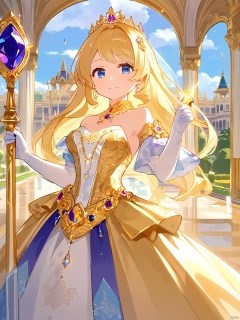 featuring a regal anime princess with golden hair adorned with jewels, dressed in an elegant gown and holding a scepter. The background is a grand palace with ornate architecture and gardens. The lighting is luxurious and grand, reflecting the royal theme. The artwork conforms to the rule of thirds, with a gently blurred background.