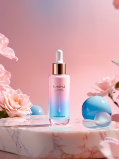 DSCJ, A transparent bottle of serum labeled "Lumina" sits on a marble countertop, its contents glowing under bright studio lights. The background is a blurred gradient of pastel pink and blue, creating a dreamy, ethereal atmosphere. The bottle stands out as the centerpiece of the image.