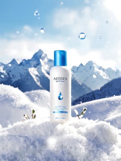 DSCJ, Photograph of a white bottle of skincare product labeled "Aespa" with a blue water droplet design. The bottle is positioned in the center of the image, surrounded by a snowy landscape with mountains in the background. The scene is serene and clean, with a shallow depth of field that keeps the background slightly blurred. The bottle is the focal point, with the snowy foreground and blue sky adding to the aesthetic. The product's name and features are prominently displayed on the label.