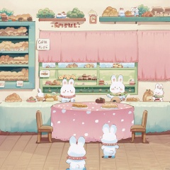 while a white rabbit sits on the right side. A pink tablecloth is draped over the table. A sign with the word "Coffee" is on the wall