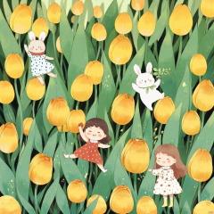 while her right arm is stretched out to the side. Her right hand is positioned in the middle of the tulips. The tulips are surrounded by green leaves