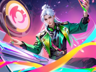 YXMX, a young man with long flowing silver hair and wearing a green and black gold jacket, sits in front of a futuristic control panel. He held the future weapon in one hand, the other hand hanging down. The background features a pink gradient, a large circular installation with abstract luminous shapes,