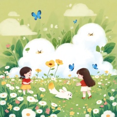 An animated image of three little girls standing in a field of flowers. The flowers are green and yellow and are surrounded by green leaves. There is a large white fluffy cloud in the top left corner of the image. There are two small blue butterflies on the right side of the cloud. The cloud is white and fluffy. The girl on the left is wearing a red shirt and has brown hair.