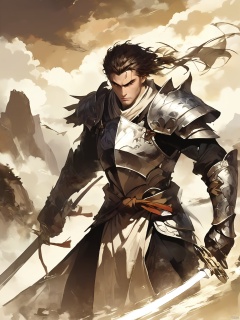 GFSM, A digital illustration of a warrior with a stern and determined look. His eyes are narrowed in focus, and his chiseled jaw is set in a firm line. He wears a suit of armor made of interlocking scales, and his sword is drawn and ready. The background is a stark, ink-brush landscape of rocky cliffs and swirling clouds, and the overall style is powerful and dynamic, reflecting the character's strength and resolve.
