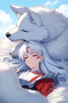 The image is an illustration of a young woman with long white hair and orange eyes, wearing a red and white outfit with a red cape. She is lying on her back with her arms stretched out to the sides and her head tilted back, as if she is sleeping. Behind her, there is a large white wolf with red eyes and sharp teeth. The wolf appears to be sleeping peacefully. The background is a blue sky with white clouds. The overall mood of the image is peaceful and serene.