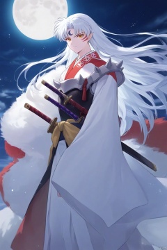The image is an illustration of a young man with long white hair and a red and white kimono. He is holding a sword in his right hand and is standing in front of a full moon. The man has a serious expression on his face and is looking towards the right side of the image. The background is dark blue with stars twinkling in the night sky. The moon appears to be a bright white color and is partially visible behind the man.