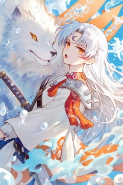 The image is an illustration of a young girl with long white hair and orange eyes. She is wearing a white and orange outfit with a red cape and is holding a sword in her right hand. The background is a blue sky with white clouds and there are several bubbles floating around her. The girl appears to be in a playful mood, with her eyes wide open and her mouth slightly open as if she is about to say something. The overall color scheme of the image is bright and vibrant, with shades of blue, orange, and yellow.