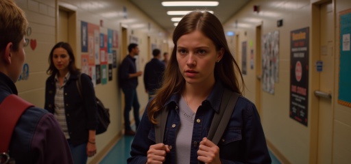 (Color style:2),(Realistic movie shot:2),(Color style:2),A close-up of the female protagonist.A high school hallway,filled with the noise of students and the clatter of lockers. The walls are adorned with posters and school spirit decorations.,Character: Casey,a new student,feeling out of place and anxious.,Action: Casey walks down the hallway,her head down,her backpack slung low on her shoulder. She avoids eye contact with the other students,who are chatting and laughing in groups. As she passes a group of popular students,they glance at her and whisper among themselves. Casey's face shows a brief flash of hurt,but she quickly composes herself and continues walking,a determined look in her eyes.,Camera Work: The camera follows Casey from behind,capturing her isolation. It then cuts to a close-up of her face,showing her vulnerability and determination. The camera also captures the reactions of the other students,emphasizing her status as an outsider.,
