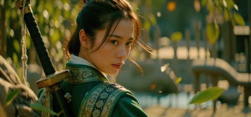 Color style,wuxia style,The protagonist is a female warrior from ancient times.She carries a precious sword on her back.,A beautiful woman in green is facing away from the camera.It is a luxurious silk robe adorned with exquisite embroidery patterns. She turns her head and looks back at the camera,with a close-up of her face. Her eyes are lonely,and strands of hair blown by the wind cover her cheeks. She is surrounded by fallen leaves.,Leaves are floating in the air,and some of them are even blocking part of the frame.,The entire scene exudes an atmosphere of poignant beauty.,