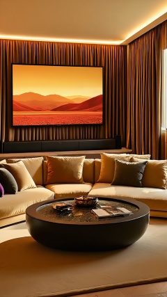SNSJ, showcasing a home theater, luxury seating, surround sound system, modern art installations, a large window with blackout curtains, ambient lighting, deep velvet walls, sleek contours, sophisticated entertainment space, movie nights, luxury modern, immersive experience.