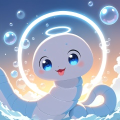 QWS, the trick-loving snake, wrapped in a tiny, angel halo, has big, innocent eyes and a tiny, white tongue sticking out in wonder. Its body is segmented into round, glowing orbs in shades of white, light blue, and silver, floating and drifting like bubbles. The background is a solid, untouched white.=