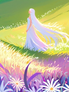YHCH, a woman with long white hair, in a flowing white dress, stood in a field of tall, vibrant green grass and blooming white flowers. The background is a gradual shade of purple and pink,