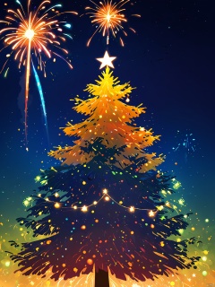 YHCH, a whimsical glowing tree at its center, has a warm gradient of tones from orange at the bottom to yellow and green at the top. The Christmas tree is surrounded by fireworks of various colors, red, blue, green and yellow, creating a festive atmosphere. The background is a deep blue night sky, interspersed with extra flashes and flickers,