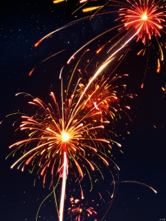 YHCH,The night sky was filled with colorful fireworks. The image captures the burst of red, yellow and white fireworks, accompanied by light trails that shoot up and out. In the background, the deep, dark sky contrasted with the bright, vivid colors of the fireworks,