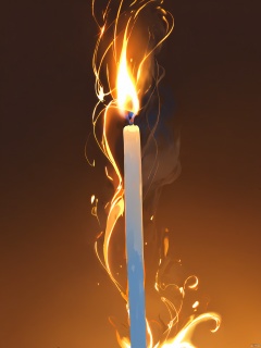 YHCH,A tall, thin candle with a bright white flame at the top, surrounded by swirling wisps of smoke and glowing embers. The background is dark warm brown, giving the image a sense of a comfortable environment. The candle has a blue wick, and the smoke and embers are different shades of orange and yellow, adding to the warm, glowing effect,