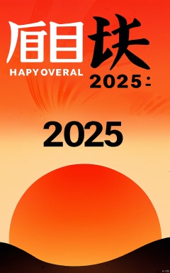 YDHB,YDHB,illustration,poster with a large red sun surrounded by wavy lines. The background is a gradient of red and orange hues,and black text reads "2025." The overall design is simple and elegant,with traditional Chinese aesthetic.,