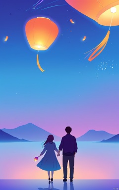 YDHB, illustration, flat poster with a minimalist illustration of a couple releasing sky lanterns. The backdrop is a gentle gradient of blues and purples, symbolizing wishes and dreams.