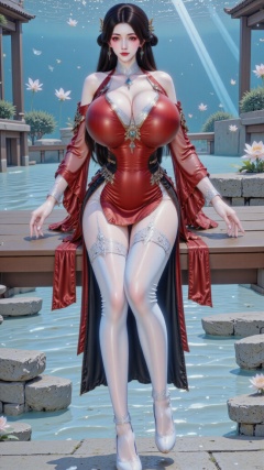 1girl,solo,sitting,crossing her hands,long hair,black hair,hair ornament,hair rings,hair bun,ponytail,double bun,bangs,thighhighs,jewelry,full body,earrings,boots,white thighhighs,white footwear,skirt,black skirt,hakama,hakama skirt,chinese clothes,dress,red dress,red long sleeves,red wide sleeves,canghaisz,HANFU DRESS.,Hugebr,changeR,luxueqi,huolinger,DTCchange,outdoors,tree,flowers,sunshine,water,yunying,狠人大帝,yunluo,lingluochen