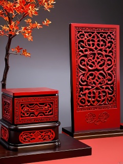 NHJ, E-commerce booth, Presented here is a mesmerizing image of an understated display: a rectangular, lacquered base in a dark wood finish stands on a pedestal adorned with intricate red carvings. The backdrop is a fiery hue of scarlet.