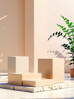 DSZT,E-commerce booth, High-quality photograph of a minimalist, modern still life setup featuring two white, textured stone blocks and a delicate, beige orchid with slender, green stems. The composition uses the rule of thirds, with the blocks and orchid positioned against a soft, beige background. The lighting is soft and diffused, likely from natural light, creating a serene and calming atmosphere. The depth of field is shallow, keeping the background slightly blurred. The camera used is likely a Canon EOS 5D Mark IV, with an aperture of f/4, shutter speed of 1/125 sec, and ISO 200. The overall aesthetic quality of the image is very high.