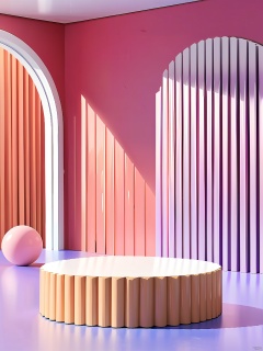 DSZT,E-commerce booth, Photograph of a minimalist, modern interior with a very high aesthetic quality. The image features a round, pink table with a white top and a matching pink base, positioned in the foreground. Behind the table, there are two vertical, floor-to-ceiling windows with white blinds. The blinds allow natural light to filter through, creating soft shadows on the light purple walls. The composition uses symmetry and leading lines to draw the eye towards the center. The depth of field is shallow, with the background slightly blurred. The lighting is natural, likely from the windows. The photo was likely taken with a DSLR camera, using a wide aperture (around f/2.8), a fast shutter speed (around 1/200s), and a low ISO (around 100).