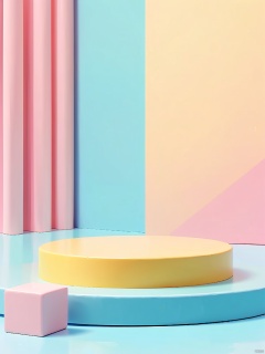 DSZT,E-commerce booth, High quality, minimalist 3D-rendered image of a pastel-colored stage with a pink circular platform, yellow border, and soft blue background. The stage is placed centrally, with three pastel-colored cubes in the background, one large blue cube and two smaller ones. The lighting is soft and diffused, creating a gentle, serene atmosphere. The composition uses symmetry and the rule of thirds. The background is in focus, and the image has a shallow depth of field. The aesthetic quality is very high.