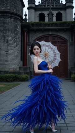 She is wearing a floor - length royal - blue feather dress. The strapless design highlights her slender waist, and the feathers on the hem are layered, like the waves of a deep ocean. The girl holds a vintage lace parasol, slightly turning to the side, with the feathers of the skirt spreading out on the ground. Behind her, the castle gates are tightly closed, creating a wonderful blend of ancient charm and her modern, fashionable beauty.