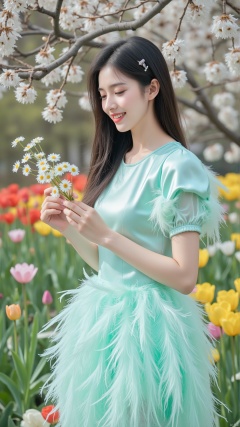 In a charming English - style garden during spring, colorful tulips, daisies, and cherry blossoms are in full bloom, filling the air with a sweet fragrance. A young Chinese woman with long, straight black hair stands among the flowers. She wears a knee - length, A - line feather dress in a soft, mint - green color. The feathers are light and delicate, giving the dress a gentle, floating quality as the breeze blows. The dress has a simple, round - neck design with short, puffed sleeves, showing off her slender arms.