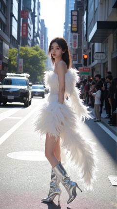 The image shows a young woman walking on a busy street in a city. She is wearing a white dress with a long, flowing skirt that reaches her knees. The skirt is made up of multiple layers of white feathers, creating a dramatic and voluminous look. The woman is also wearing a pair of silver high-heeled boots with a pointed toe and a chunky heel. She has long dark hair that is styled in loose waves and is looking off to the side with a serious expression on her face. The background shows tall buildings and cars on the street, and a crowd of people can be seen on the right side of the image. The sky is blue and the sun is shining brightly, casting a warm glow on the scene.